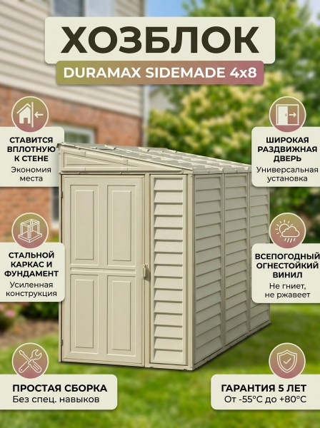 Пластиковый хозблок Duramax SIDEMADE - ОписаниеВиниловый хозяйственный сарай - является замечательным решением для семьи, которой не хватает еще чуть-чуть места, чтобы хранить свои вещи. Эта мобильная постройка очень компактна и легко влезет на любой участок в какой-нибудь укромный уголок. Несмотря на свои скромные размеры, домик имеет внушительный объем, а армированный каркас обеспечивают высокую прочность.