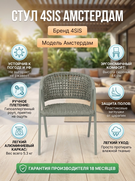Стул 4SIS "Амстердам" роуп серый круглый - ОписаниеСтул «Амстердам» для обустройства обеденной или лаунж-зоны. Изготовлен из алюминиевого каркаса, оплетенного вручную эластичными синтетическими лентами из высокопрочных полиэфирных волокон. Роуп является гипоаллергенным, прочным, износостойким и устойчивым к ультрафиолету. Приятный на ощупь и напоминает шерстяное плетение. Цвет каркаса и оплетки – серый. На ножках стула идут серые пластиковые наконечники (заглушки).