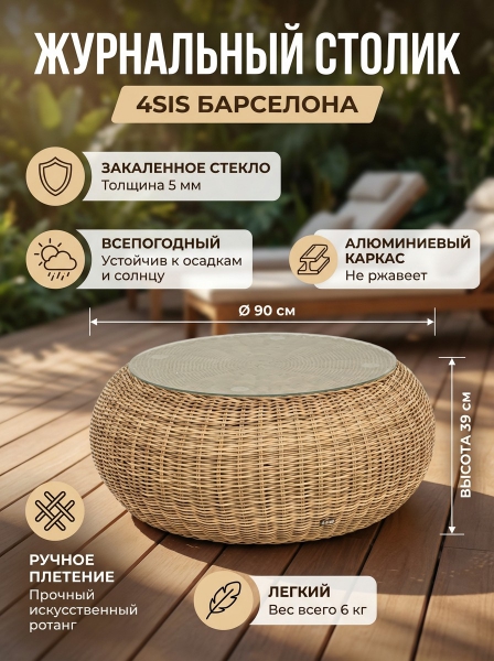 Журнальный столик 4SIS "Барселона" из искусственного ротанга, цвет соломенный - ОписаниеЖурнальный столик «Барселона» используется как в комплекте, так и в качестве отдельного предмета для сада, открытой террасы или балкона. Каркас столика изготовлен из алюминия, вручную оплетенного круглым искусственным ротангом. Столешница из закаленного стекла толщиной 5 мм. Благодаря износостойким материалам, стол пригоден для использования на улице при любой погоде и не требует специальных условий хранения. Плетеный столик представлен в соломенном цвете.