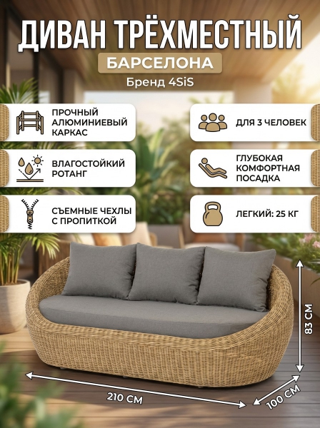Диван 4SIS "Барселона" трёхместный, ротанг соломенный - ОписаниеДиван «Барселона» идеально подходит для размещения трех человек. Он имеет алюминиевый каркас, который выдерживает повышенные нагрузки. Для оплетки каркаса используется высококачественный искусственный ротанг. Мебель выполнена в соломенном цвете. Трехместный диван дополняют мягкие подушки в серо-коричневом цвете со съёмными чехлами. Тканевые изделия выполнены из прочного полиэстера плотностью 230гр/м2. Материал имеет влагоотталкивающую пропитку.