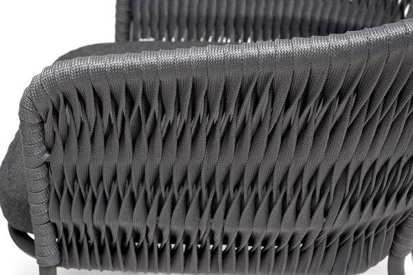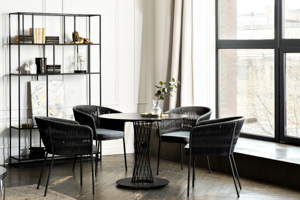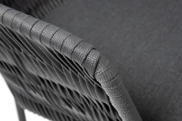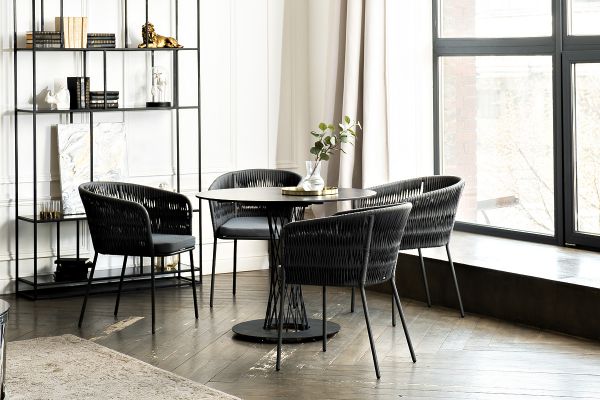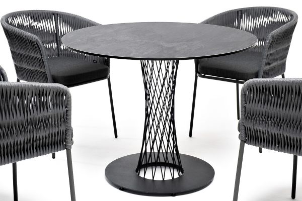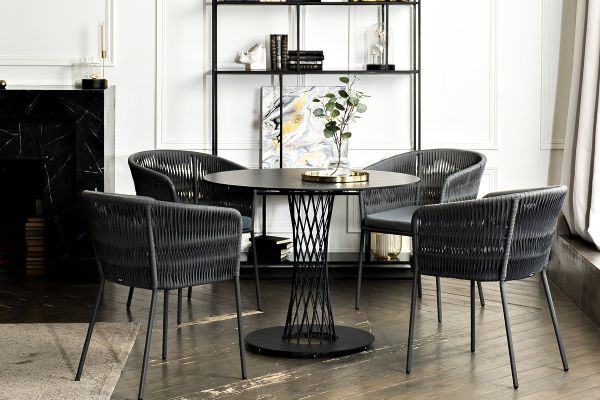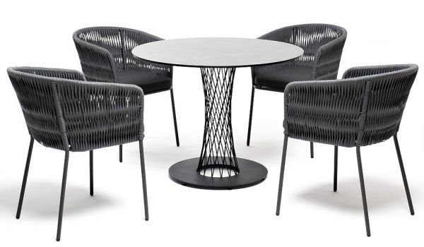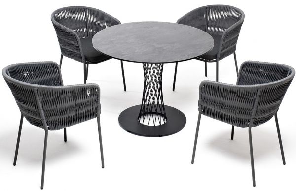 Диего обеденная группа на 4 персоны со стульями 4SIS Бордо - ОписаниеОбеденная группа «Диего» предназначена для комфортного размещения 4 человек. В комплект входят стол «Диего» с HPL-пластиковой столешницей, диаметром 900 мм в цвете «серый гранит». Высота данного стола составляет 750 мм, что обеспечивает оптимальный уровень для сидения и расположения посуды. Вместе с этим, в комплектацию входит 4 плетеных стула «Бордо», выполненных с использованием высокопрочного роуп-волокна серого цвета с плетением вида «колос». Стулья имеют размеры 570×620×775 мм и устойчивый каркас из алюминия, окрашенной порошковой краской темно-серого цвета. Обеденная группа «Диего» является стильным и практичным решением для обустройства кухни или жилой зоны, она идеально сочетается с различными интерьерами благодаря универсальности использованных материалов и цвета. Она подходит как для ежедневного использования, так и для приема гостей, обеспечивая удобство сидения и качественное исполнение всех элементов.