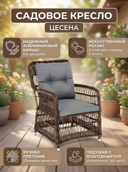 Кресло 4SIS "Цесена" из искусственного ротанга, цвет коричневый - ОписаниеКресло «Цесена» имеет практичные подлокотники для удобного размещения во время отдыха.