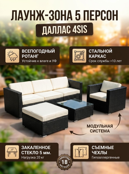 Лаунж-зона из искусственного ротанга на 5 персон 4SIS Даллас - ДоставкаДоставка по Санкт-Петербургу: бесплатно, 2-3 дня Доставка по России: стоимость уточняйте у оператора. Лаунж-зона из искусственного ротанга на 5 персон 4SIS Даллас - Отзывы0.0