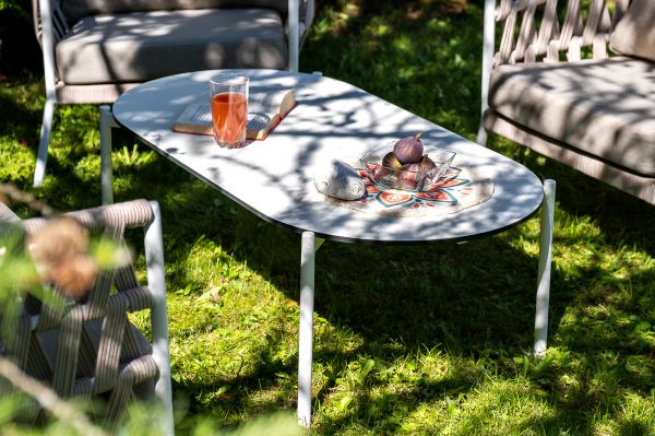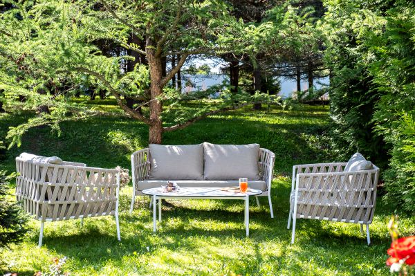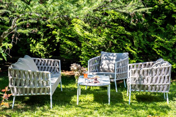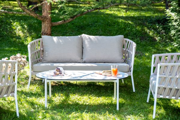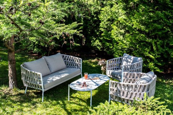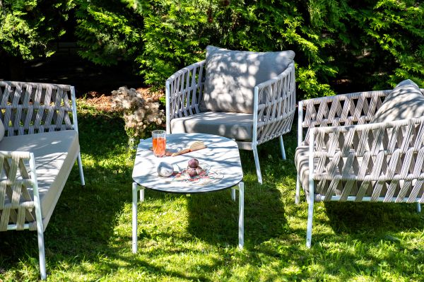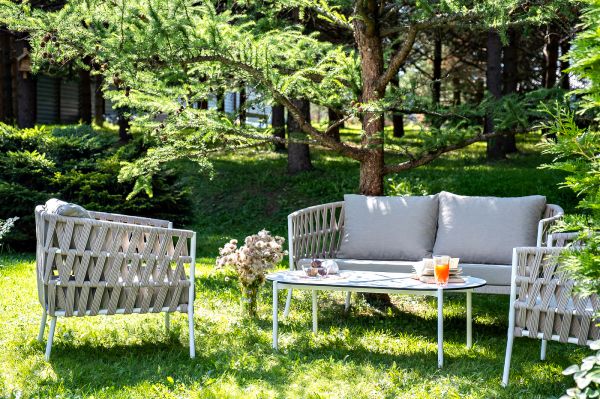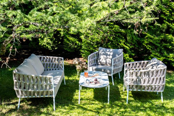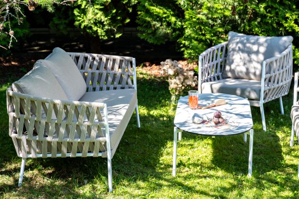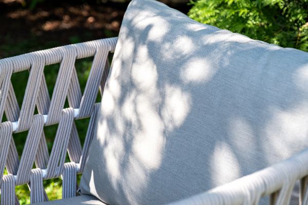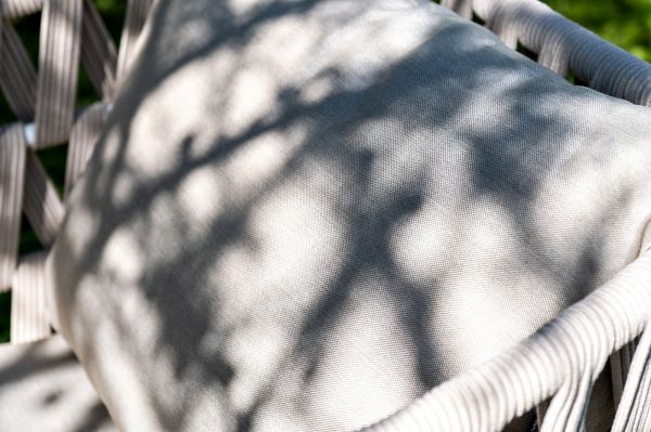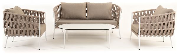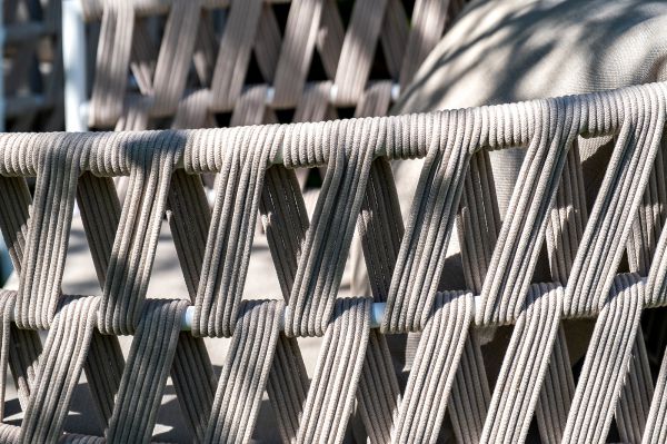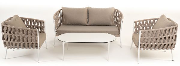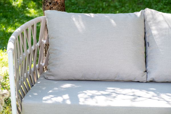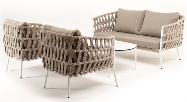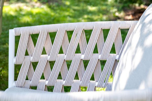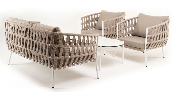 Каркас уличной мебели выполнен из износостойкого алюминия. Его дополняет бежевая ручная оплетка, изготовленная на основе эластичных синтетических лент из полиэфирных волокон высокой прочности (роупа). Кресла и диван идут в комплекте с мягкими подушками в чехлах бежевого цвета.