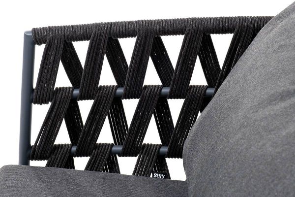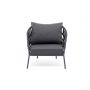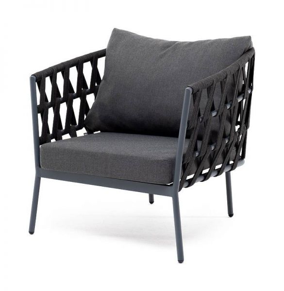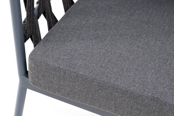Кресло 4SIS "Диего" роуп темно-серый круглый, ткань темно-серая 027 - ОписаниеПлетеное кресло «Диего» с подушками в комплекте. Кресло имеет алюминиевый каркас, окрашенный порошковой краской в темно-серый (RAL7024) цвет. Боковины каркаса вручную оплетены роупом - эластичными синтетическими лентами, изготовленными из высокопрочных полиэфирных волокон. Цвет оплетки - темно-серый. Подушки состоят из наполнителя и съёмных чехлов, которые обработаны влагоотталкивающей пропиткой темно-серого цвета. Чехол можно стирать в стиральной машине с использованием порошков.