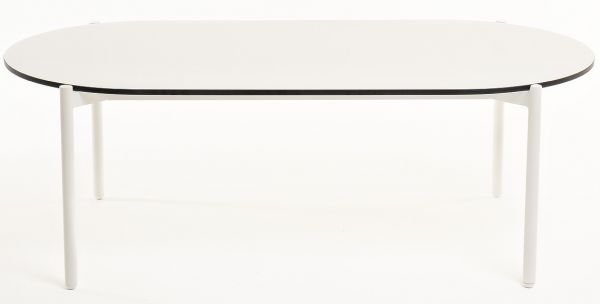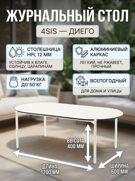 Журнальный стол из HPL 4SIS Диего - ОписаниеЖурнальный стол «Диего» представляет собой идеальное решение для организации зоны отдыха в гостиной или на летней веранде. Столешница - овальная, выполнена из высококачественного монолитного компакт-пластика HPL, толщиной 12 мм. Цвет столешницы - «молочный» . Подстолье - алюминиевая профильная труба, окрашенная износостойкой краской белового цвета. Размер журнального стола: 1200 × 600 × 400 мм.