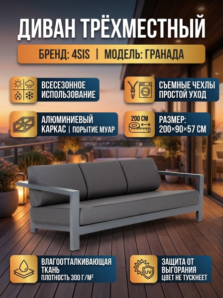 Диван 4SIS "Гранада" трёхместный, ткань темно-серая 027 - ОписаниеСтильный трехместный диван «Гранада» для обустройства зоны отдыха на балконе, в кафе или летней веранде. Каркас изготовлен из высокопрочного алюминия темно-серого (RAL7024) цвета. В комплекте предусмотрены мягкие подушки со съёмными чехлами. Диван также подходит для всесезонного использования на открытом воздухе. Диван можно доукомплектовать креслами из этой же линейки, создав лаунж-зону с большим количеством мест.