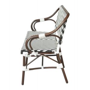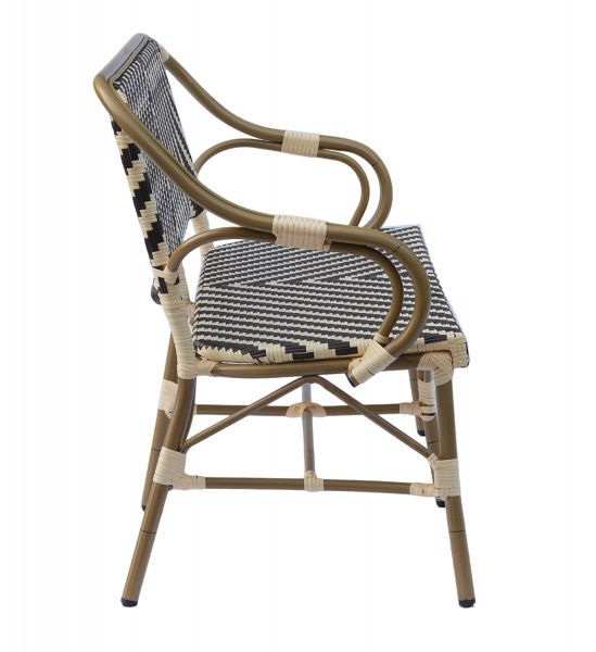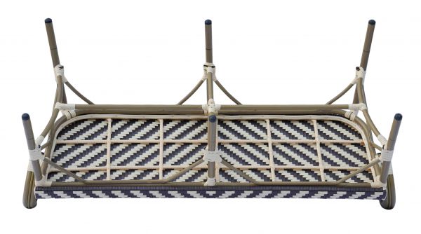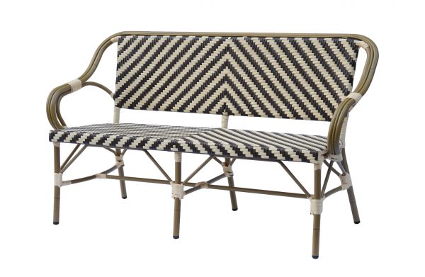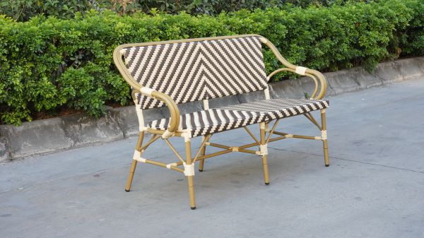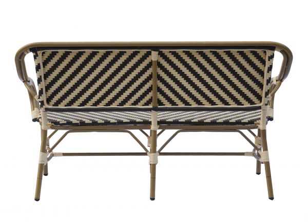 Каркас выполнен из алюминия, окрашенного износостойкой краской бежевого оттенка. Конструкция имеет изогнутую трубчатую опору диаметром 28×1,5 мм. Плетение выполнено вручную из плоского искусственного ротанга 12×1,3 мм. Цвет оплетки - бежево-коричневый. Широкая спинка стула позволяет комфортно расположиться, а сидение расслабиться. Диван легко очищается от загрязнений, удобен в эксплуатации. Ножки оснащены специальными заглушками, которые защищают их от влаги и улучшают устойчивость на неровной поверхности.