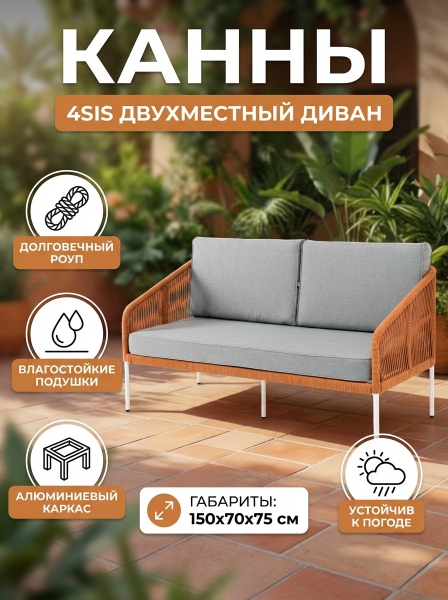 Диван 4SIS "Канны" двухместный, роуп оранжевый меланж круглый, ткань светло-серая - ОписаниеДвухместный плетеный диван «Канны» - это стильный и удобный элемент для отдыха на открытом воздухе или в помещении. Он изготовлен из качественного и прочного материала - роупа цвета оранжевый меланж, обеспечивающий высокую стойкость к износу и долговечность изделия. Основой дивана является алюминиевый каркас светло-серого (RAL7035) цвета, что делает его легким и устойчивым к коррозии. В комплекте идут удобные подушки с наполнителем и съёмными чехлами, которые обработаны водоотталкивающим составом. Материал чехлов - 100% полиэстер с плотностью 300 гр/м2.