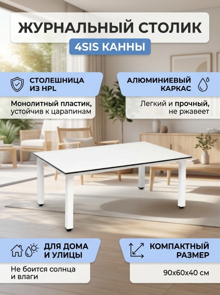 Журнальный столик 4SIS "Канны" из HPL, цвет молочный - ОписаниеЖурнальный стол «Канны» идеально подходит для создания уютной зоны отдыха в вашем доме или на террасе. Он не только стильный, но и функциональный - вы сможете разместить на нем книги, журналы, чашки с напитками и другие предметы. Основными преимуществами стола являются его эстетическая привлекательность и прочность конструкции. Подстолье из алюминия обеспечивает стабильность и долговечность стола, а покрытие белого цвета придает ему свежий и аккуратный вид. В свою очередь, столешница из монолитного компакт-пластика HPL обладает высокими характеристиками прочности и износостойкости. Благодаря этому стол будет служить вам долгое время, сохраняя свою первоначальную форму и цвет. Габариты стола позволяют разместить его в любом помещении, не занимая много места. Таким образом, вы сможете создать комфортную зону для чтения, общения и отдыха, которая будет радовать вас своим уютом и стильным дизайном.