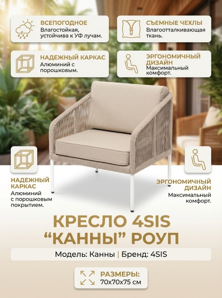 Кресло 4SIS "Канны" роуп бежевый круглый, ткань бежевая 15052 - ДоставкаДоставка по Санкт-Петербургу: бесплатно, 2-3 дня Доставка по России: стоимость уточняйте у оператора. Кресло 4SIS "Канны" роуп бежевый круглый, ткань бежевая 15052 - Отзывы0.0