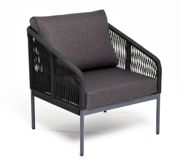 Кресло плетеное из роупа (веревки) 4SIS «Канны» серый каркас - ОписаниеПлетеное кресло «Канны» идеально подходит для комфортного отдыха в саду или на балконе. Прочный каркас из алюминия окрашен в насыщенный серый цвет порошковой износостойкой краской. Покрытие прочное, устойчивое к возникновению сколов и ржавчины.