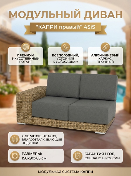Модуль диванный 4SIS "Капри" правый с подушками, цвет соломенный - ОписаниеПравый модуль «Капри», выполненный из круглого искусственного ротанга соломенного оттенка, позволяет использовать не только как самостоятельный элемент, но и быть частью лаунж-зоны, в которую данная модель превосходно интегрируется. В комплект входят подушки серого цвета.