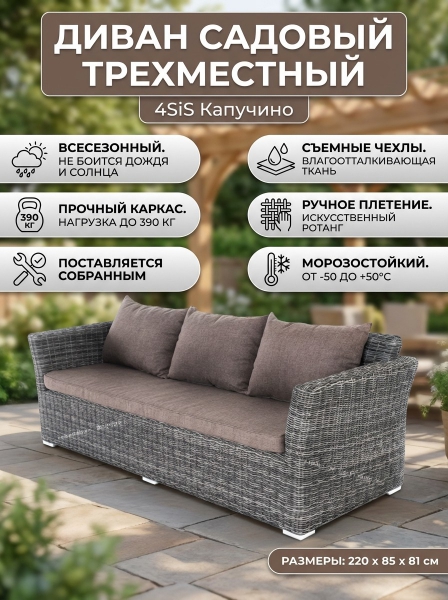 Диван из искусственного ротанга трехместный 4SIS «Капучино» - ОписаниеДиван «Капучино» предназначается для размещения трех человек. Его основание изготовлено из алюминиевого каркаса, способного выдерживать большие нагрузки. Мебель декорирована ручным круглым плетением, выполненным из искусственного ротанга. Трехместный диван укомплектован мягкими подушками, которые защищены съемными чехлами в темно-сером оттенке. При их пошиве используется износостойкий полиэстер, плотность которого достигает 230гр/м2. Предусмотрена влагоотталкивающая пропитка.