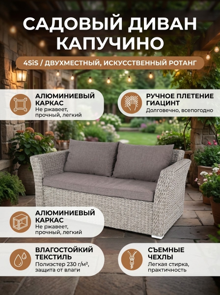 Диван из искусственного ротанга (гиацинт) 4SIS «Капучино» двухместный, серый - ОписаниеДиван «Капучино» двухместный с каркасом из прочного алюминия. Размер модели – 1700×865×815 мм.