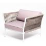 Кресло имеет алюминиевый каркас, окрашенный порошковой краской в белый цвет. Боковины каркаса вручную оплетены роупом - эластичными синтетическими лентами, изготовленными из высокопрочных полиэфирных волокон. Цвет оплетки - бежевый.