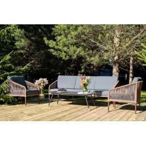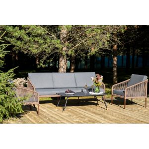 Каркас уличной мебели выполнен из износостойкого алюминия. Его дополняет серо-коричневая ручная оплетка, изготовленная на основе эластичных синтетических лент из полиэфирных волокон высокой прочности (роупа).