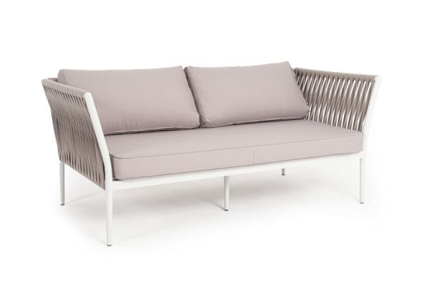 Диван плетенный из роупа двухместный 4SIS «Касабланка» - ОписаниеДвухместный диван «Касабланка» с подушками в комплекте. Диван имеет алюминиевый каркас, окрашенный порошковой краской в белый цвет. Боковины каркаса вручную оплетены роупом - эластичными синтетическими лентами, изготовленными из высокопрочных полиэфирных волокон. Подушки со съемными чехлами, которые обработаны влагоотталивающей пропиткой.
