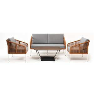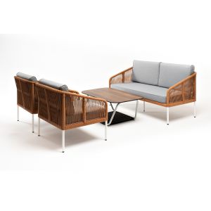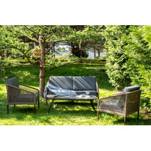 Диван и кресла изготовлены их алюминиевого прочного каркаса, оплетенного ручным способом роупом серо-коричневого цвета. Это эластичные ленты из полиэфирных волокон высокого качества. Каркас окрашен в белый цвет износостойкой порошковой краской.