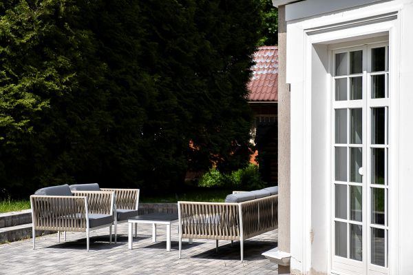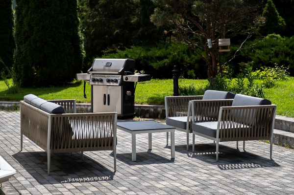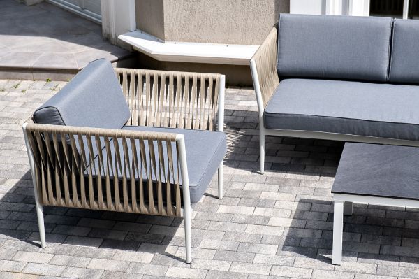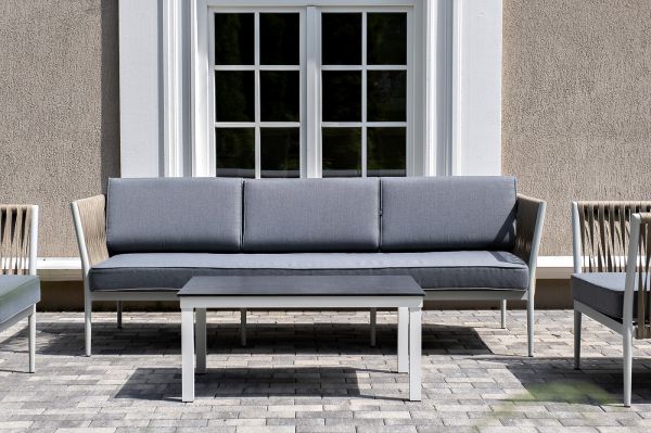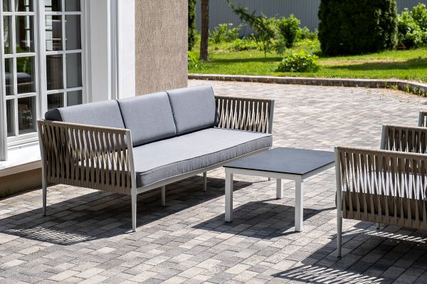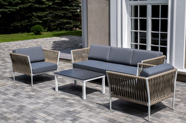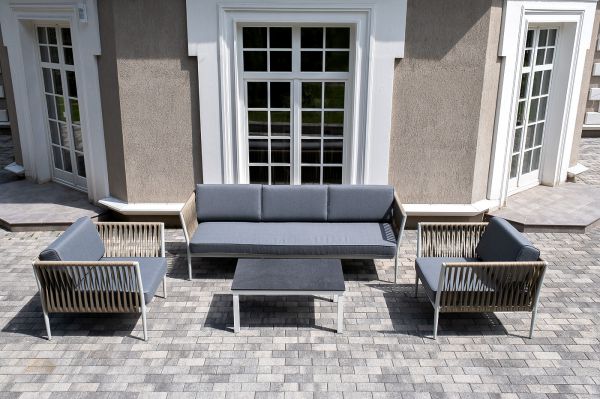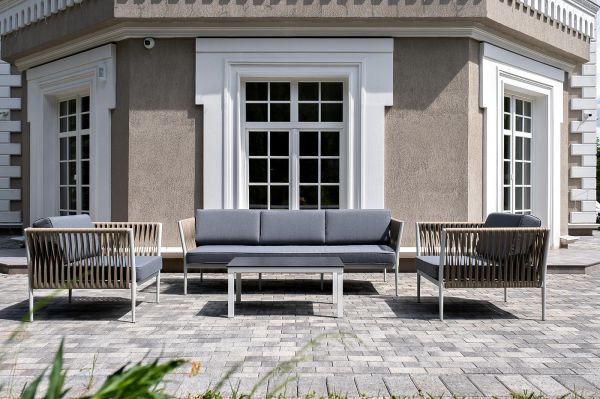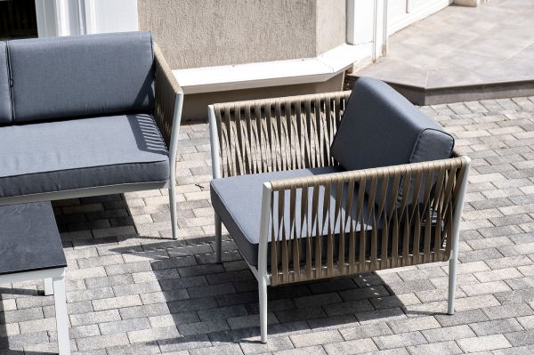 Диван и кресла изготовлены их алюминиевого прочного каркаса, оплетенного ручным способом роупом серо-коричневого цвета. Это эластичные ленты из полиэфирных волокон высокого качества. Каркас окрашен в светло-серый (RAL7035) цвет износостойкой порошковой краской.