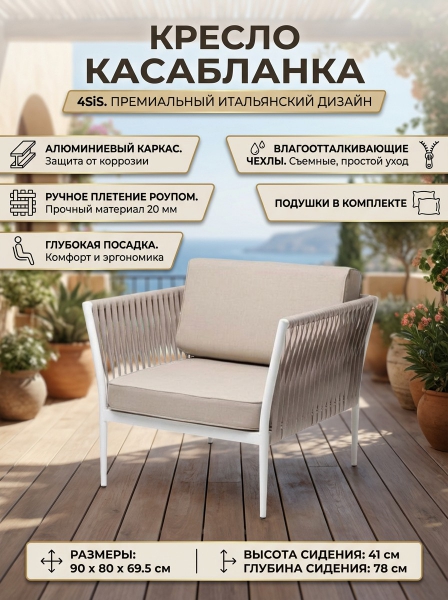 Кресло 4SIS "Касабланка" роуп бежевый 20мм, ткань бежевая 15052 - ОписаниеПлетеное кресло «Касабланка» с подушками в комплекте. Кресло имеет алюминиевый каркас, окрашенный порошковой краской белового цвет. Боковины каркаса вручную оплетены роупом - эластичными синтетическими лентами, изготовленными из высокопрочных полиэфирных волокон. Цвет оплетки - бежевый. Подушки состоят из наполнителя и съёмных чехлов, которые обработаны влагоотталкивающей пропиткой бежевого цвета. Чехол можно стирать в стиральной машине с использованием порошков.