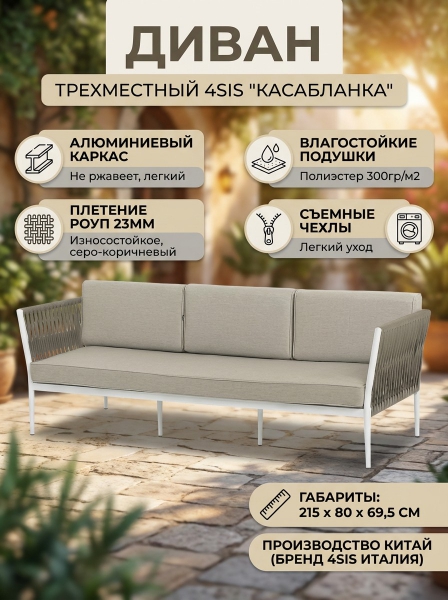 Диван 4SIS "Касабланка" трёхместный, роуп серо-коричневый 23мм, ткань бежевая 15052 - ОписаниеТрехместный диван «Касабланка» с подушками в комплекте.