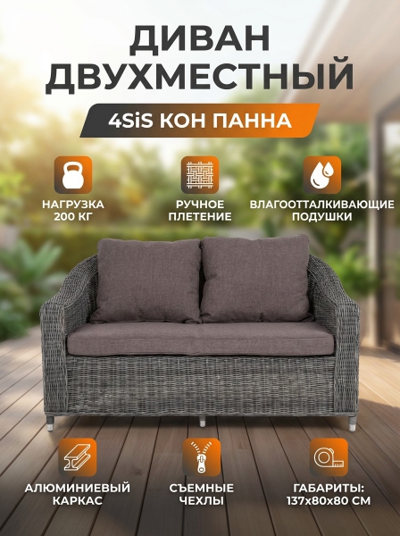 Диван из искусственного ротанга двухместный 4SIS «Кон Панна» - ОписаниеДиван из искусственного ротанга «Кон Панна» дает возможность комфортно расположить две персоны благодаря комплектным подушкам из полиэстера с влагоотталкивающей пропиткой.