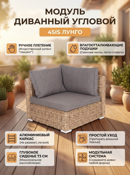 Модуль диванный угловой из ротанга (гиацинт) 4SIS «Лунго» - ОписаниеУгловой диванный модуль «Лунго» из искусственного ротанга вида "гиацинт", является неотъемлемой частью лаунж-зоны. В своем основании имеет каркас из алюминия, который вручную оплетен ротангом. В комплектации предусмотрены подушки из полиэстера, пропитанные влагоотталкивающим составом.