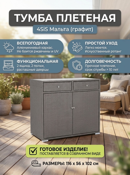 Тумба плетеная из искусственного ротанга 4SIS «Мальта» - Описание"Мальта" тумба изготовлена из алюминиевого каркаса, оплетенного плоским искусственным ротангом. Оснащена двумя выдвижными ящиками и двумя полками внутри. Закрывается на распашные дверцы.