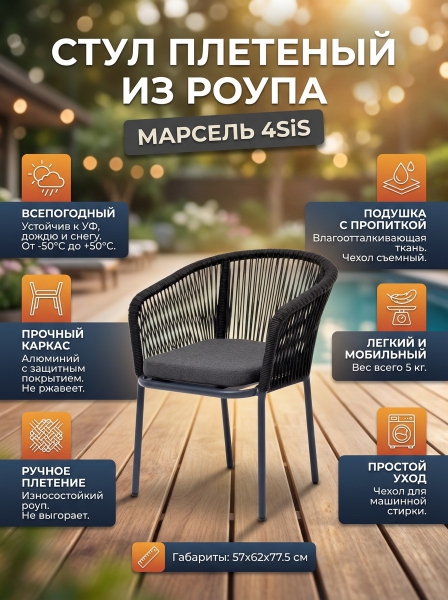 Стул плетеный из роупа 4SIS «Марсель» каркас алюминий темно-серый (RAL7024) муар - Вопросы по товаруСтул плетеный из роупа 4SIS «Марсель» каркас алюминий темно-серый (RAL7024) муар - ОписаниеСтул "Марсель" предназначен для организации обеденной зоны или зону лаунж. Выполнен из алюминиевого каркаса темно-серого (RAL7024) цвета. Оплетка - современный материал "роуп", которым каркас оплетался вручную. Роуп - это эластичные синтетические ленты, изготовленные из высокопрочных полиэфирных волокон. Цвет оплетки - темно-серый.