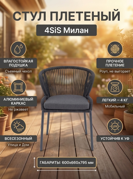 Стул плетеный из роупа 4SIS «Милан» каркас алюминий темно-серый (RAL7024) муар - ОписаниеСтул "Милан" для обустройства обеденной или лаунж-зоны. Изготовлен из алюминиевого каркаса, оплетенного вручную эластичными синтетическими лентами из высокопрочных полиэфирных волокон (роуп круглый). Цвет каркаса темно-серый (RAL7024), оплетки - темно-серый.