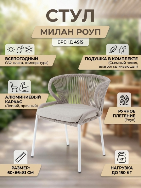 Стул 4SIS "Милан" роуп бежевый круглый, ткань бежевая 15052 - ОписаниеСтул «Милан» для обустройства обеденной или лаунж-зоны. Изготовлен из алюминиевого каркаса, оплетенного вручную эластичными синтетическими лентами из высокопрочных полиэфирных волокон (роуп круглый). Цвет каркаса и оплетки - бежевый. В комплект входит подушка со съёмным чехлом из 100%-го полиэстера с влагоотталкивающей пропиткой.