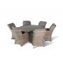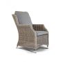 Спинка и подлокотники имеют плавные линии, благодаря своим закругленным формам. Каркас мебели сделан из алюминия. Присутствует ручное круглое плетение, при изготовлении которого используется искусственный ротанг. Представлено в серо-соломенном цвете.