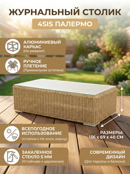 Журнальный столик из искусственного ротанга 4SIS «Палермо» - ОписаниеЖурнальный столик «Палермо» используется как в комплекте, так и в качестве отдельного предмета для сада, открытой террасы или балкона.