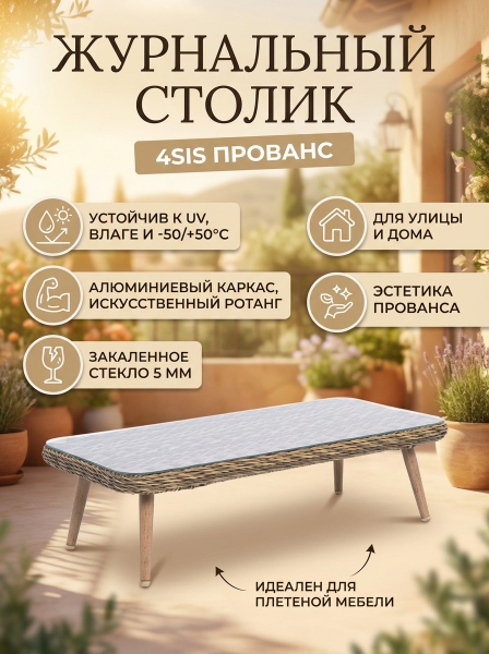 Журнальный столик из ротанга 4SIS "Прованс" цвет соломенный - ОписаниеЖурнальный столик «Прованс» является удачным дополнением для кресел и диванов из той же линейки мебели. Алюминиевый каркас имеет цвет натурального дерева. Столик дополняет декоративная оплетка, при изготовлении которой используется круглый искусственный ротанг. Она представлена в соломенном цвете. Столешницу из ротангового плетения дополняет прочное стекло, используемое для изготовления мебели. Стекло крепится с помощью держателей на силиконовых присосках и транспортируется в собранном виде.