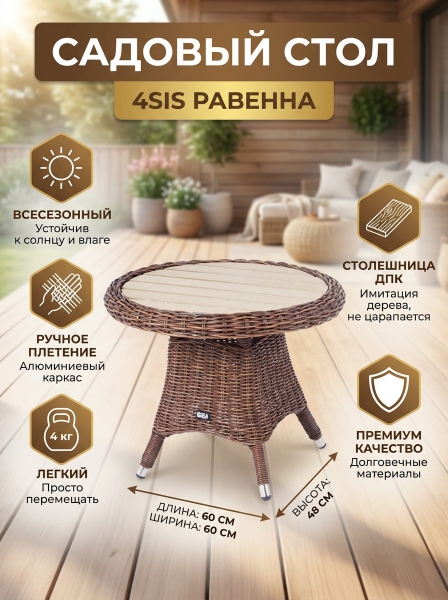 Садовый стол из искусственного ротанга 4SIS «Равенна» - ОписаниеСтолик «Равенна» может использоваться как в роли кофейного, так и в качестве детского обеденного стола.