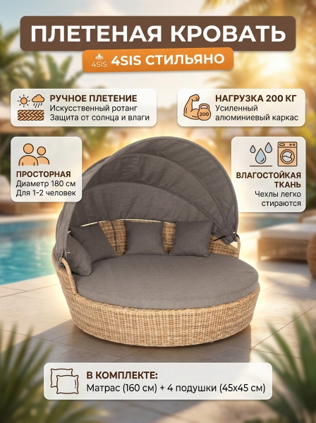 Плетеная кровать круглая 4SIS «Стильяно» - Описание«Стильяно» - кровать из искусственного ротанга круглой формы. Она идеально подойдет для использования на открытом воздухе, в том числе и возле бассейна. Функциональная круглая кровать выполнена плетением вручную из искусственного ротанга. Конструкция усилена алюминиевым каркасом. Козырек откидывающийся, выполнен из водостойкой полиэфирной ткани. Мягкий матрас имеет съемный чехол темно-серого цвета, подлежит машинной стирке.
