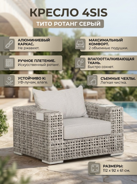 Кресло 4SIS "Тито" ротанг серый - ОписаниеПлетеное кресло «Тито» является гармоничным дополнением зоны отдыха на открытом воздухе.