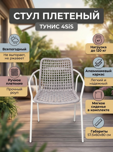 Стул плетенный из роупа 4SIS «Тунис» - ОписаниеСтул плетеный "Тунис" из роупа, полиэфирной веревки с каркасом из алюминия белого цвета.