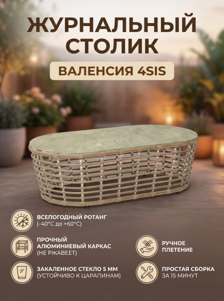 Журнальный столик 4SIS "Валенсия" из искусственного ротанга, цвет соломенный - ОписаниеЖурнальный столик «Валенсия» используется как в комплекте, так и в качестве отдельного предмета для сада, открытой террасы или балкона. Каркас столика изготовлен из алюминия, вручную оплетенного круглым искусственным ротангом. Столешница из закаленного стекла толщиной 5 мм. Благодаря износостойким материалам, стол пригоден для использования на улице при любой погоде и не требует специальных условий хранения. Плетеный столик представлен в соломенном цвете.