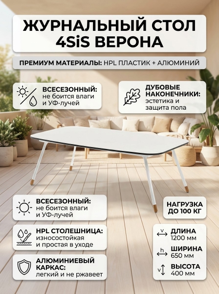 Журнальный стол из HPL 4SIS Верона - ОписаниеЖурнальный стол «Верона» представляет собой идеальное решение для организации зоны отдыха в гостиной или на летней веранде. Благодаря своему стильному дизайну и высококачественным материалам, он будет служить долгое время и при этом сохраняет свою первозданную красоту. Каркас столика изготовлен из алюминия, окрашенного в белый цвет. Алюминий является легким и прочным материалом, что обеспечивает долговечность и надежность изделия. На ножках столика идут дубовые наконечники (заглушки). Столешница изготовлена из прочного и устойчивого к механическим воздействиям компакт-пластика HPL в молочном цвете. Благодаря этому сочетанию материалов, интерьерный стол будет прекрасно смотреться в любом помещении и станет удачным дополнением к вашему интерьеру.