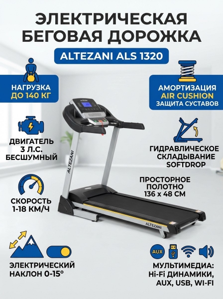 Беговая дорожка Altezani ALS 1320 - ДоставкаДоставка по Санкт-Петербургу: бесплатно, 2-3 дня Доставка по России: стоимость уточняйте у оператора. Беговая дорожка Altezani ALS 1320 - Отзывы0.0