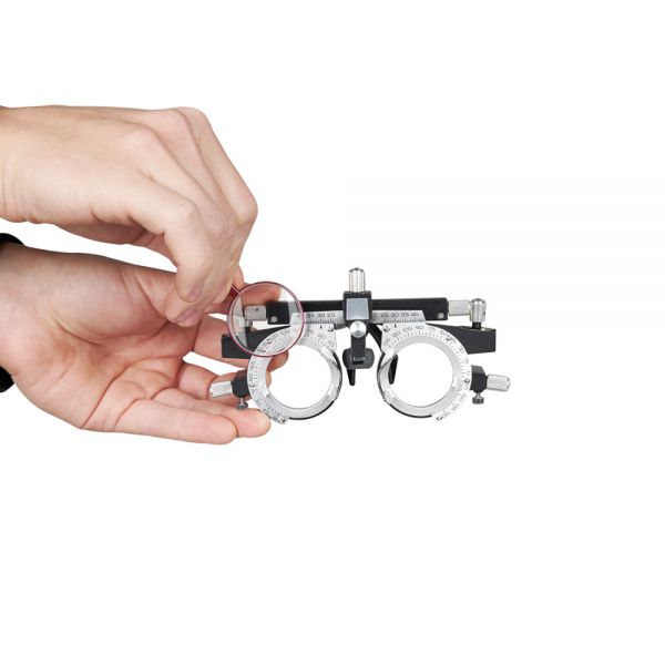 | | Универсальная оправа: | Универсальная пробная оправа регулируется с помощью шарнирных винтов и подходит для проверки зрения у пользователей с различной формой и размером головы. Два зажима оправы удерживают до 4 линз каждый, позволяя точно выбрать подходящую диоптрию. Регулировка оправы даёт возможность изменять ось цилиндрических и призматических линз и межзрачковое расстояние, а также найти удобное положение подушки для носа.