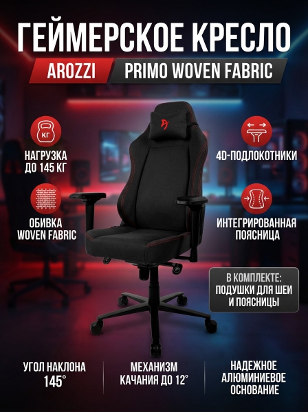 Геймерское кресло Arozzi Primo Woven Fabric - Black - ДоставкаДоставка по Санкт-Петербургу: бесплатно, 2-3 дня Доставка по России: стоимость уточняйте у оператора. Геймерское кресло Arozzi Primo Woven Fabric - Black - Отзывы0.0