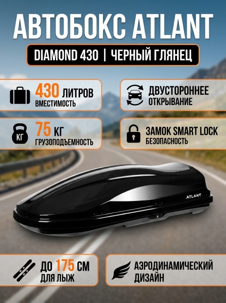 Автомобильный бокс Atlant Diamond 430 л черный глянец - ДоставкаДоставка по Санкт-Петербургу: бесплатно, 2-3 дня Доставка по России: стоимость уточняйте у оператора. Автомобильный бокс Atlant Diamond 430 л черный глянец - Отзывы0.0