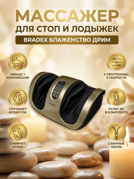 Массажер для стоп и лодыжек BRADEX «БЛАЖЕНСТВО ДРИМ» - ОписаниеСомневаетесь? - Посмотрите рейтинг ТОП-10 по категории «Массажеры»Массажер для стоп и лодыжек БЛАЖЕНСТВО ДРИМ, золотой. Стимуляции рефлекторных точек стопы с помощью двух типов воздействия: точечного массажа Шиацу и глубокого компрессионного массажа. Боковые валики выполнены из термопластичного каучука, что обеспечивает более нежное касание и комфортное ощущение в процессе использования. Персональный режим , доступны 3 варианта массажа : пальцы, свод ноги и стопа. Три скорости вращения роликов: низкая, средняя и высокая и 2 направления вращения помогают выбрать оптимальный режим массажа. Съёмные чехлы позволяют следить за чистотой массажера по мере необходимости и наслаждаться его работой с комфортом.