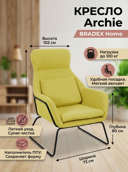 Кресло Bradex Home Archie - ОписаниеМягкое и сдержанное, стильное и практичное, надёжное и удобное, это оно — кресло Archie. Этот элегантный предмет интерьера впишется в дизайн гостиной, прихожей, деткой, кабинета, веранды или лоджии. Кресло имеет комфортные и мягкие сидение и спинку. Обивка кресла выполнена из практичного и приятного на ощупь вельвета, неприхотливого в уборке и легко поддающегося сухой чистке при помощи пылесоса, щётки или валика. Визуально лёгкая конструкция надёжного кресла в трендовых оттенках не будет перегружать интерьер.
