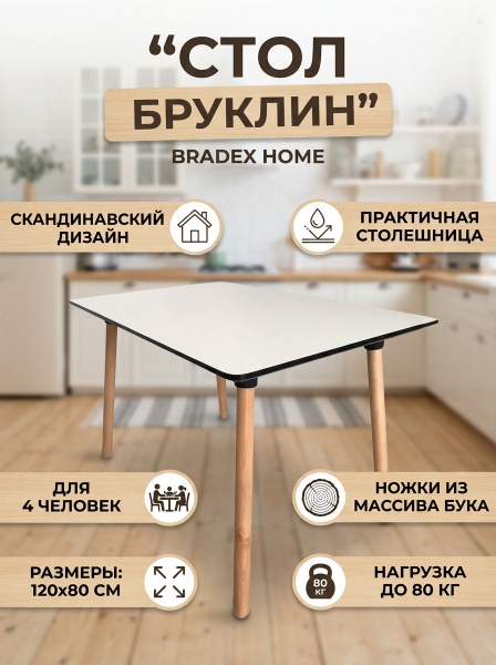 Стол BRADEX HOME Brooklyn 120х80х73,5см, белый (стол с незначительным сколом) - ОписаниеБелый кухонный стол Brooklyn с ножками из бука подходит для большинства современных интерьеров, включая кухни в популярном скандинавском стиле. Нейтральный оттенок сочетается с любой цветовой гаммой, а благодаря прямоугольной форме кухонный стол подходит даже для маленькой кухни и позволяет комфортно разместиться семье из четырех человек. Столешница устойчива к влаге и повседневным загрязнениям, что делает обеденный стол Brooklyn невероятно простым в уходе.