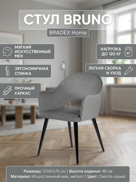Стул BRADEX HOME Bruno - ОписаниеСтул Bruno выполнен из искусственного меха на устойчивом металлическом каркасе, отличающимся прочностью и элегантностью. Широкая мягкая спинка обеспечит позвоночнику отличную опору в течение длительного времени. Благодаря своему внешнему виду, он отлично впишется в любой современный интерьер.