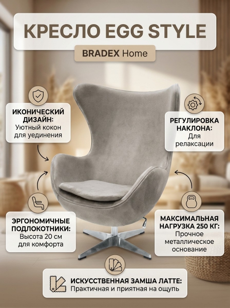 Кресло BRADEX HOME EGG STYLE CHAIR латте, искусственная замша - ДоставкаДоставка по Санкт-Петербургу: бесплатно, 2-3 дня Доставка по России: стоимость уточняйте у оператора. Кресло BRADEX HOME EGG STYLE CHAIR латте, искусственная замша - Отзывы0.0
